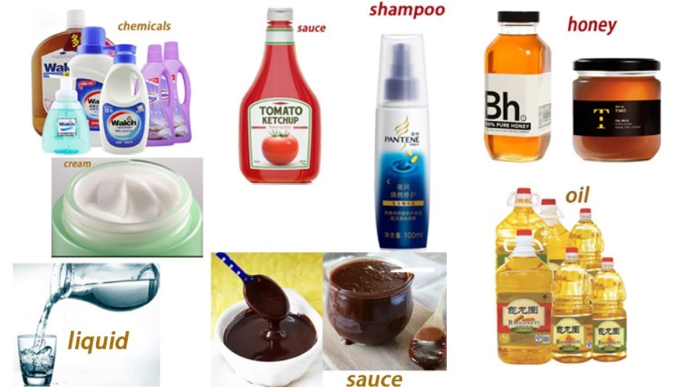 Полу-вискозне и вискозне течности; мачка, сенф, сирупи, салса, мајонез, мед, маслац од кикирикија, желе, умаци за потапање, балзам за усне, шампон, густи сапуни, гелови за обликовање, маске за лице, восак, лепак, масти, заптивне масе, силикон и још много тога